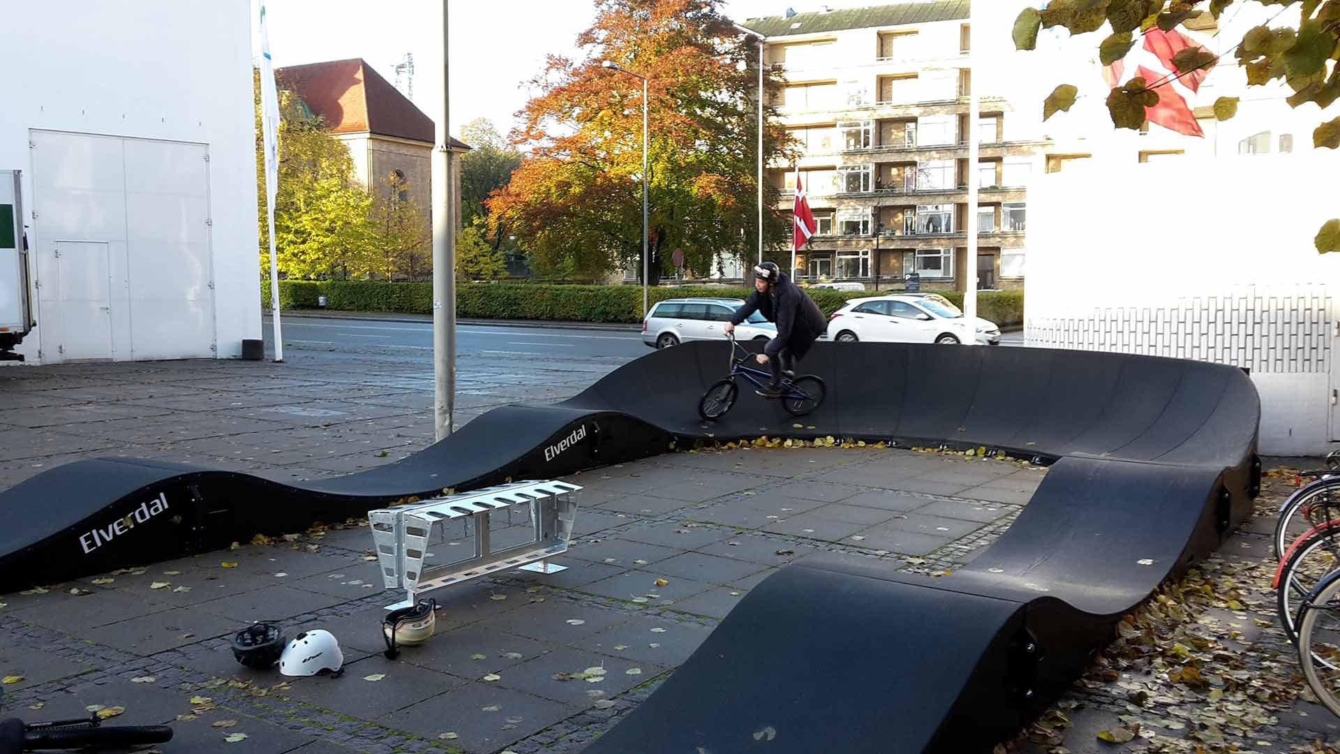 The pictures show our latest realization, the PC1 modular pumptrack, which was installed in Denmark. Pumptrack is located at the Aalborg Trade Center. The length of the bicycle track is 37 m.