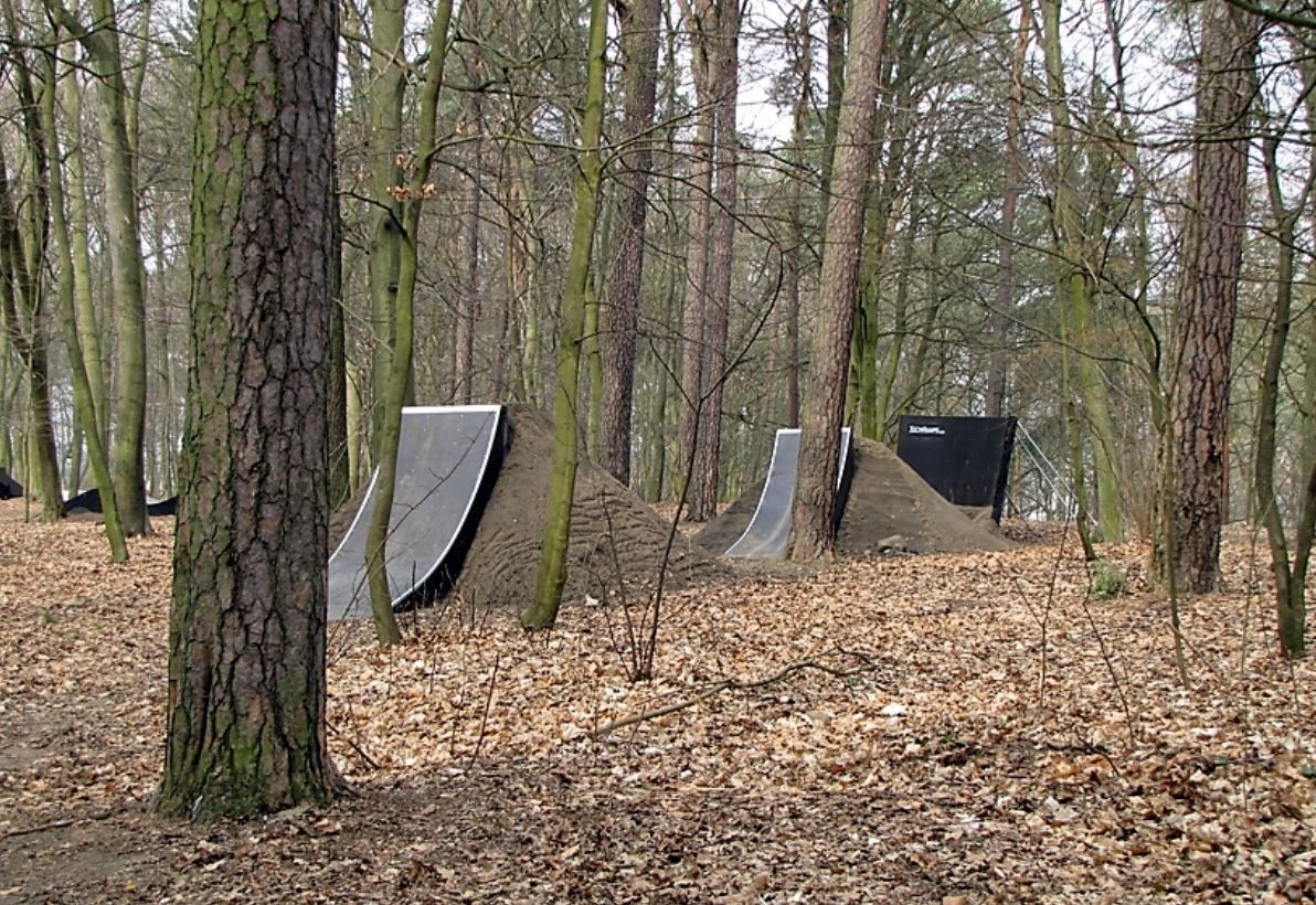Cycling track in Choszczno (Poland) consists of components like: footbridge, Curved Wallride, Pumptrack, Northshore, Kicker x4, Jump + Box, Wallride, Rollin.