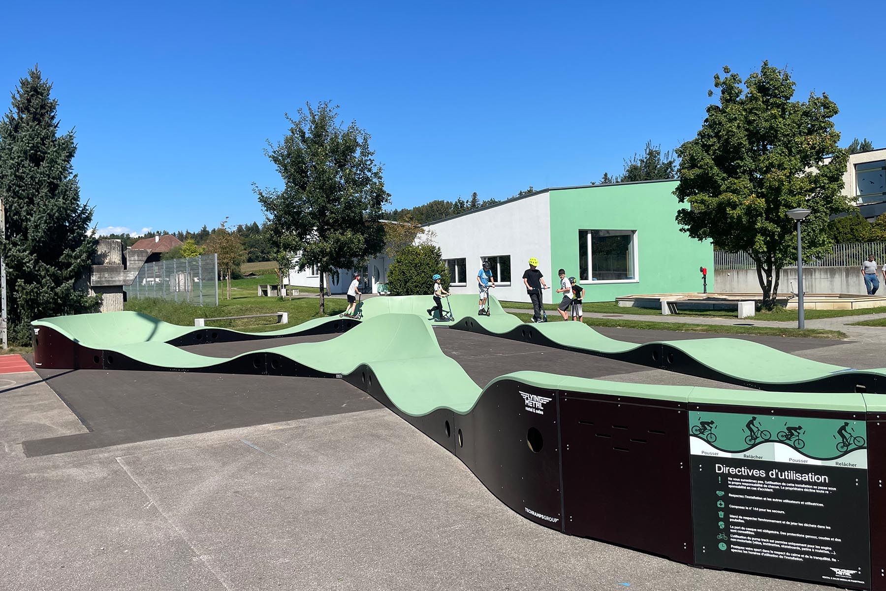 Familiepompbaan met een lengte van 60 m, gelegen in Rubigen, kanton Bern, bij Schule Rubigen, Worbstrasse 13. Uitgerust met zijpanelen en in- en uitstapmodules, evenals 6 stickers op de panelen. Deze aangepaste pumptrack is een geweldige plek voor actief plezier voor het hele gezin.