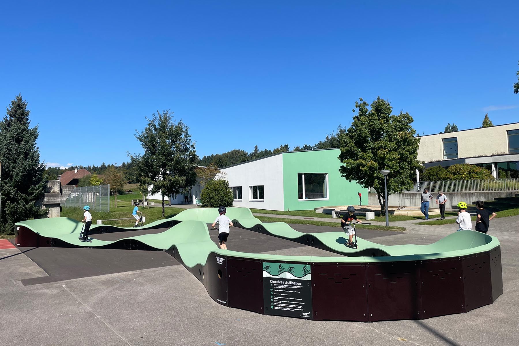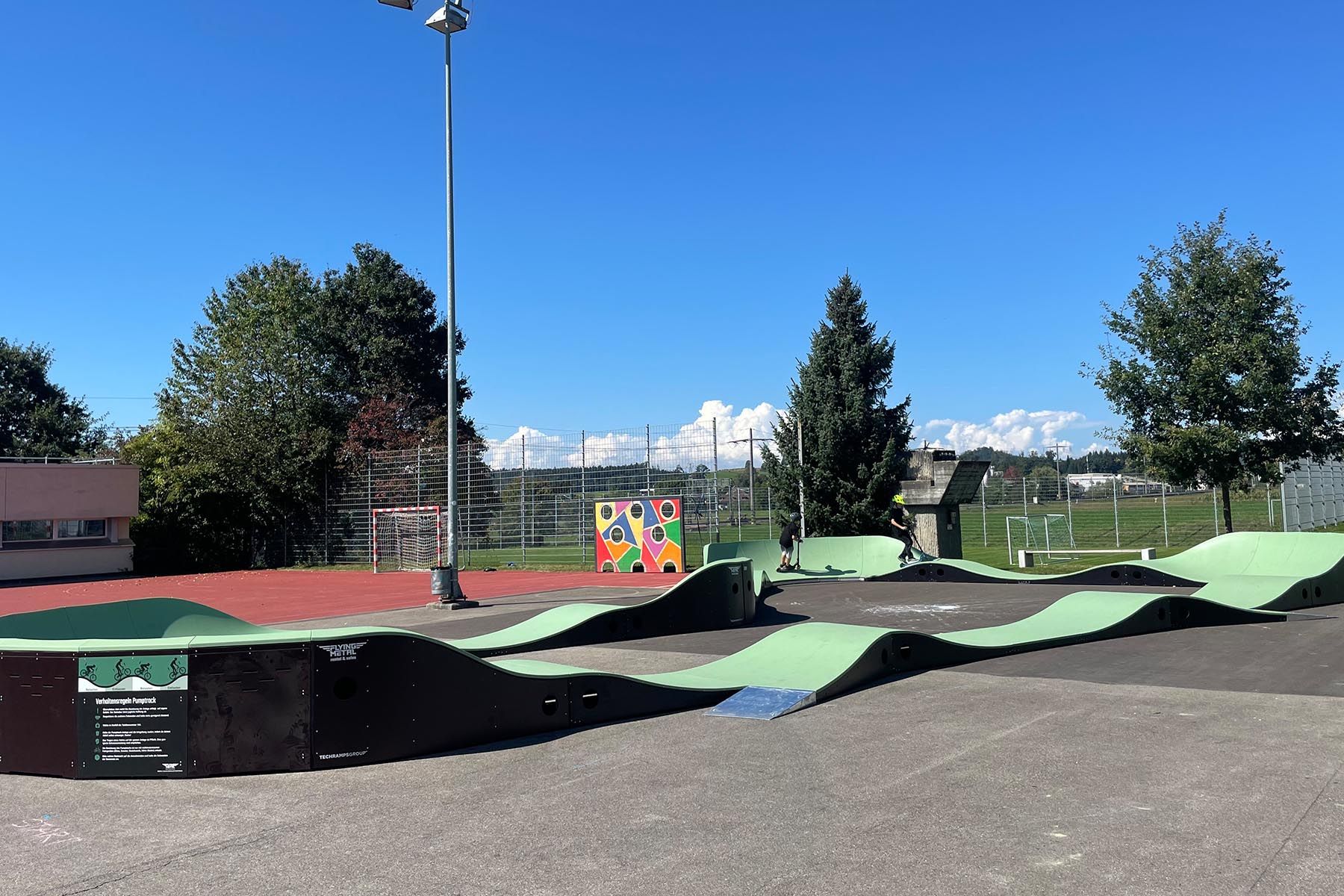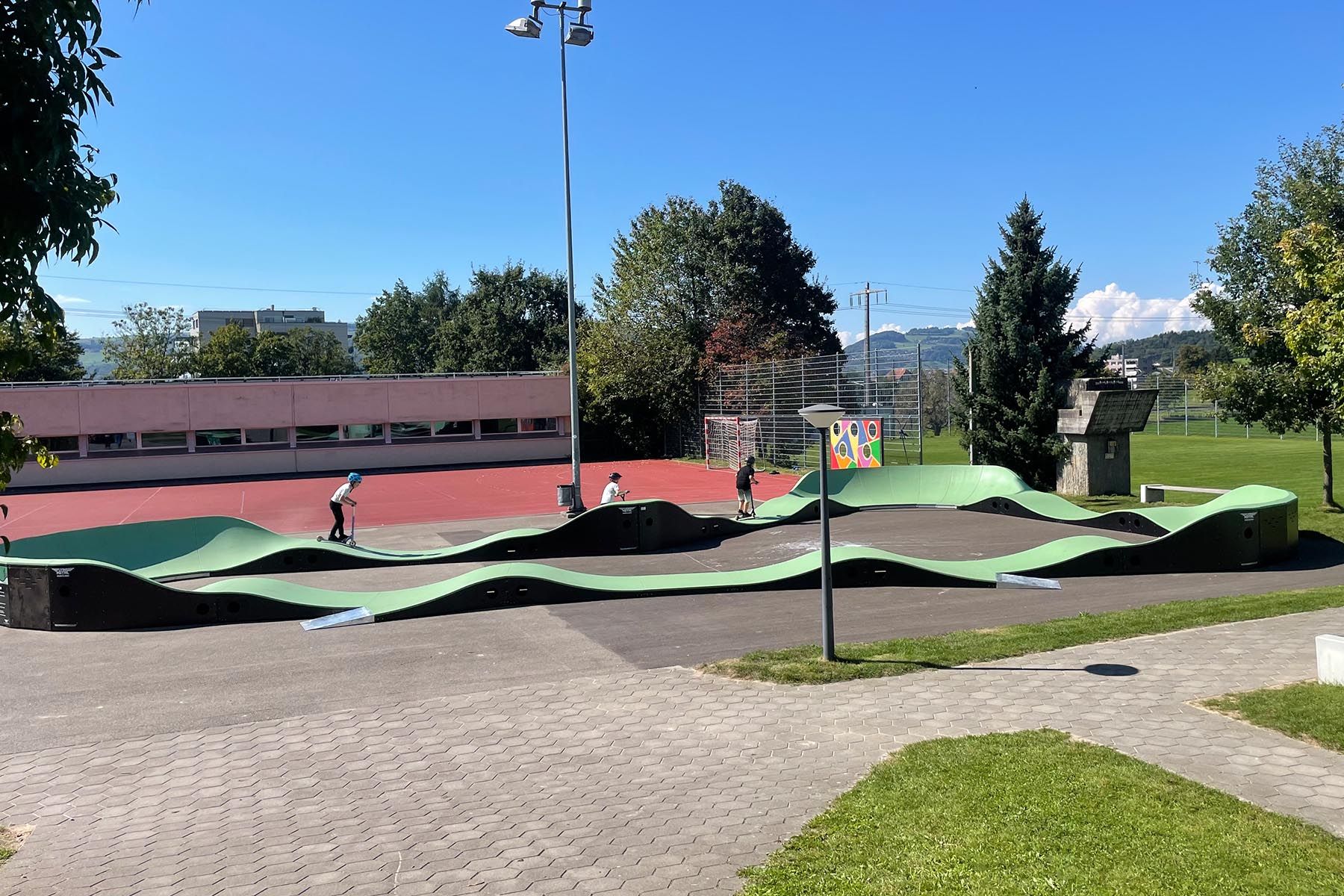 60 m langfamiliepumptrack som ligger i Rubigen, kanton Bern, ved Schule Rubigen, Worbstrasse 13. Utstyrt med sidepaneler og inn- og utkjøringsmoduler, samt 6 klistremerker på panelene. Denne spesialtilpassede pumptracken er et flott sted for aktiv moro for hele familien.