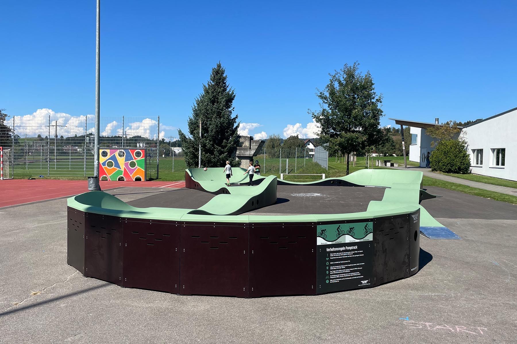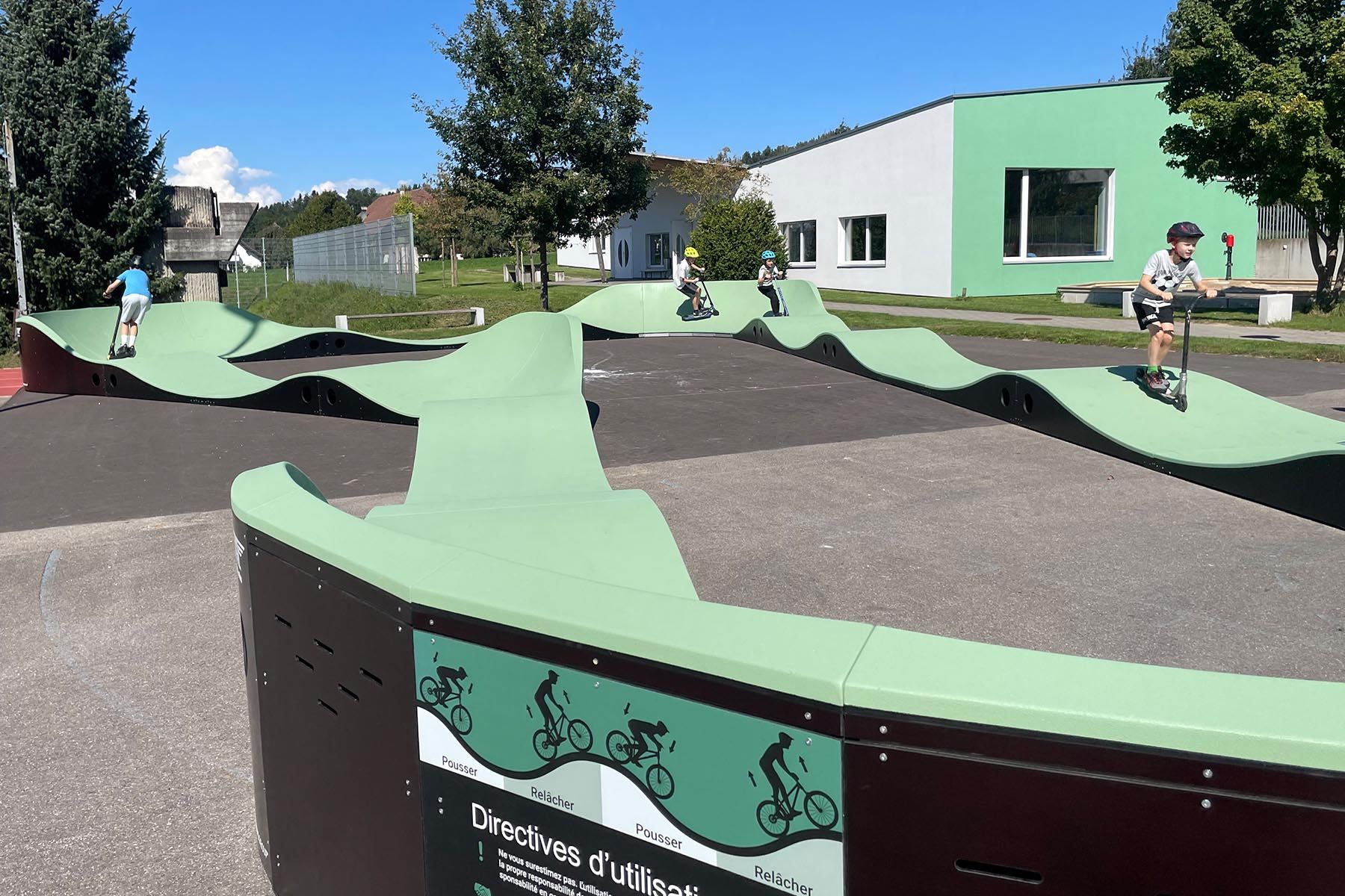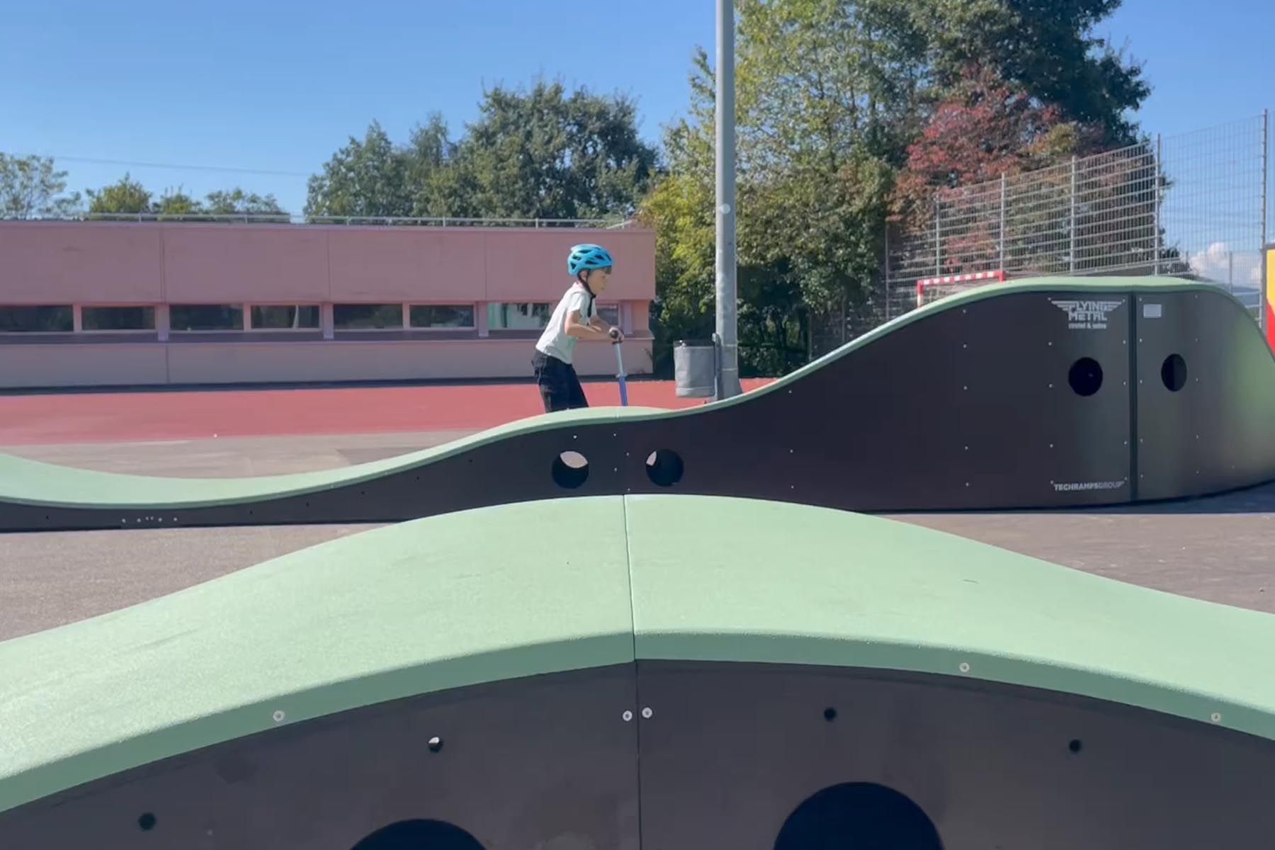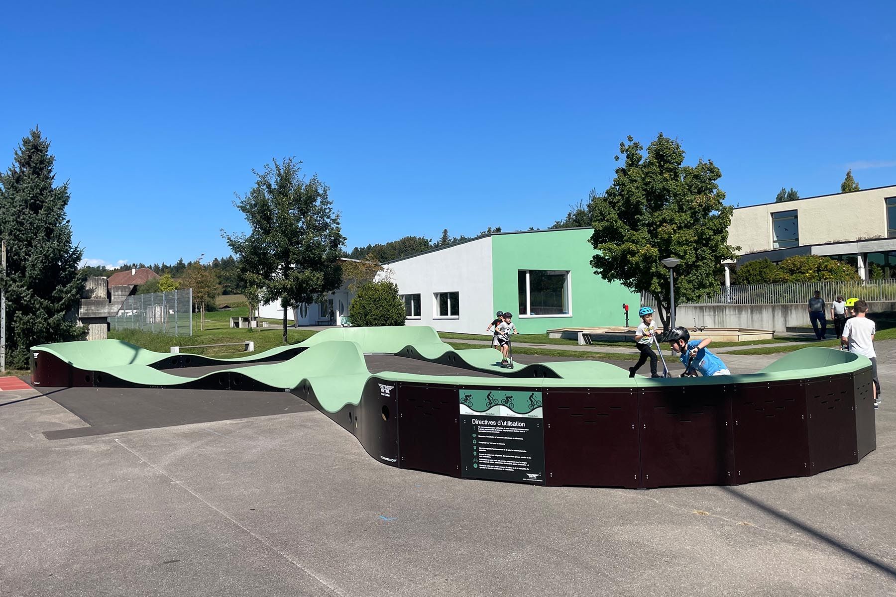 60 m langfamiliepumptrack som ligger i Rubigen, kanton Bern, ved Schule Rubigen, Worbstrasse 13. Utstyrt med sidepaneler og inn- og utkjøringsmoduler, samt 6 klistremerker på panelene. Denne spesialtilpassede pumptracken er et flott sted for aktiv moro for hele familien.