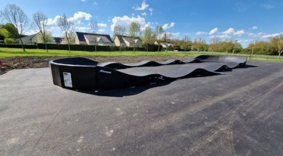 Den nye modulbanen til speedwaybyen Beaufort-en-Anjou. Sort kompositt pumptrack, 45 m lang. Pumptrack er lokalisert i Marais Saint-Benoît, Frankrike.