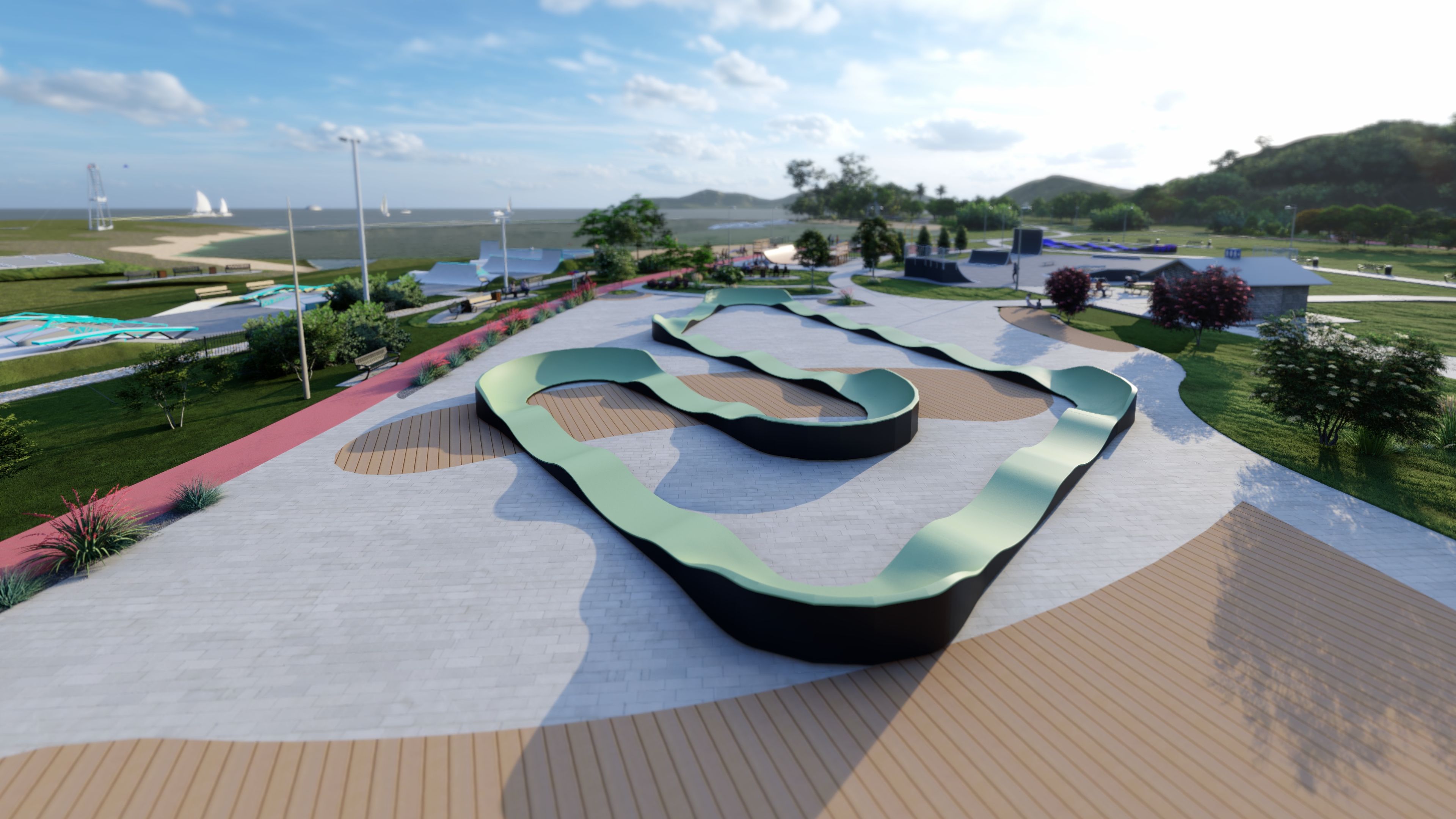 Pumptrack DELTA PF15E er en avansert bane med en lengde på 96,1 m, ideell for syklister som ønsker utfordringer og variasjon i kjøringen. Den dekker et areal på 30,02 x 33,63 m, noe som gir en bred og variert bane som passer både nybegynnere og erfarne brukere. Takket være den robuste konstruksjonen og gjennomtenkte designen er Pumptrack DELTA PF15E ideell for parker, rekreasjonsområder og andre offentlige rom, og gir en intens opplevelse og aktiv rekreasjon for alle sykkelentusiaster.