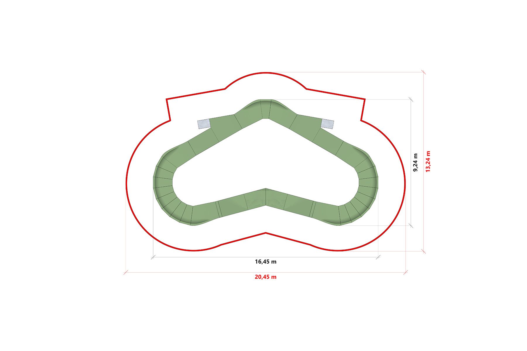 Pumptrack ELBE z serii Flow o długości 43,3 m to tor zaprojektowany z myślą o bardziej dynamicznej i płynnej jeździe. Charakterystyczny układ zakrętów oraz fal tworzy linię przejazdu, która angażuje użytkownika nie tylko w ruch góra–dół, ale również prawo–lewo, dzięki czemu jazda staje się bardziej rytmiczna i intuicyjna. Taka geometria pozwala utrzymywać prędkość bez pedałowania, a jednocześnie daje wiele możliwości wyboru linii przejazdu.