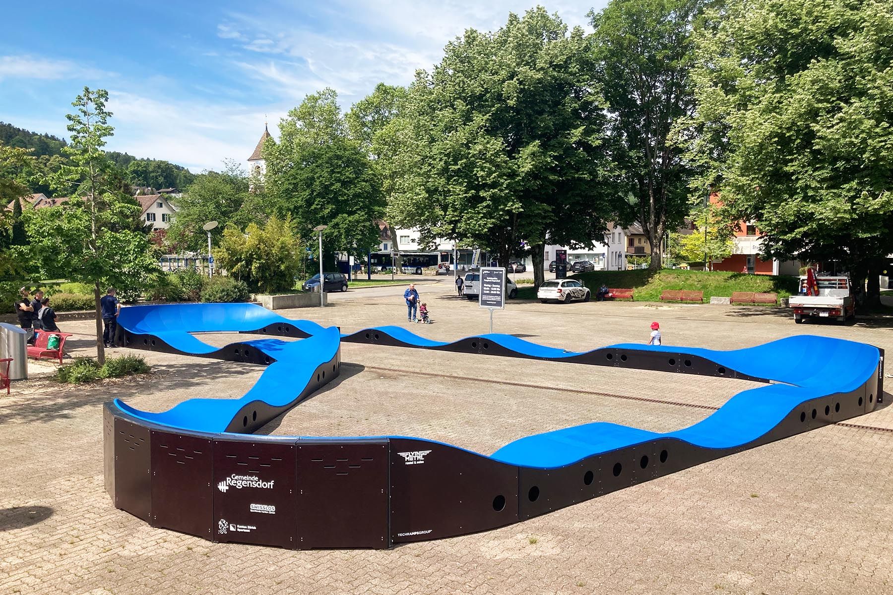 Pumptrack modułowy Brooklands PC3E w Regensdorfie, Szwajcaria, to tor o długości 59 metrów, z niebieskim asfaltem jako nawierzchnią. Zapewnia doskonałą zabawę dla rowerzystów, rolkarzy i deskorolkarzy, umożliwiając dynamiczną jazdę bez pedałowania, dzięki specjalnym konstrukcjom, które umożliwiają generowanie prędkości poprzez pompowanie.